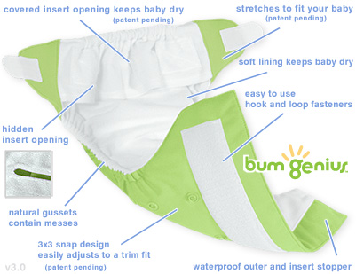 The Bum Genius diapers come in two parts. There’s an outside part which looks like a regular diaper as well as an insert the slides inside. Both the diapers and the inserts are adjustable in size thanks to a series of snaps. Basically, they grow with your kid, which means you theoretically won’t have to buy more until they’re potty trained. We’ve got two different kinds of Bum Genius diapers: ones that close with velcro and ones that close with snaps. Personally, I prefer the velcro because they’re more adjustable and you don’t have to count how many buttons you’re going for. This might not seem like much of a task, but that just means you either haven’t changed a squirmy baby or haven’t done so in a while. The downside to the velcro ones, though, is that you have to make sure to afix the tab to an inside tab when you throw the used diaper in the bin, otherwise they’ll all get stuck together in the laundry.