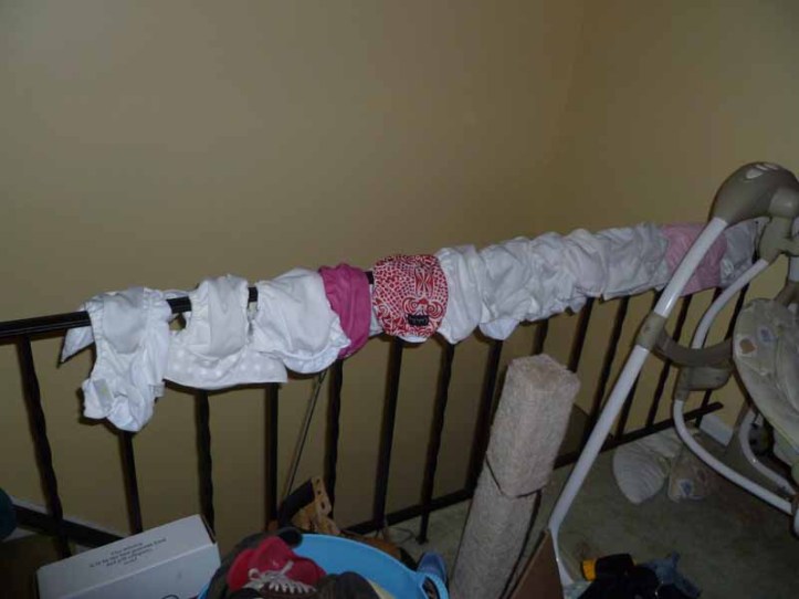 Which brings me to the topic of laundry. If you use cloth diapers you will be doing it all the damn time. We do a diaper wash every other day, almost without fail. My wife usually gets the wash started by doing a spin cycle to get any solids off and give everything a good soaking. After that one of us–usually her–puts the detergent in and sets the washer to Whitest Whites. It’s a special brand called Ecos that doens’t have any chemicals and is supposed to be good for their skin. After that, we have to separate the inserts from the covers. The inserts go in the dryer while the covers get hung around our house to dry. We don’t have a yard, so we wind up using the shower curtain in our bathroom and the railing leading down to our front door.