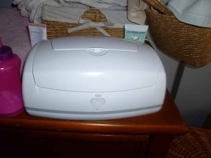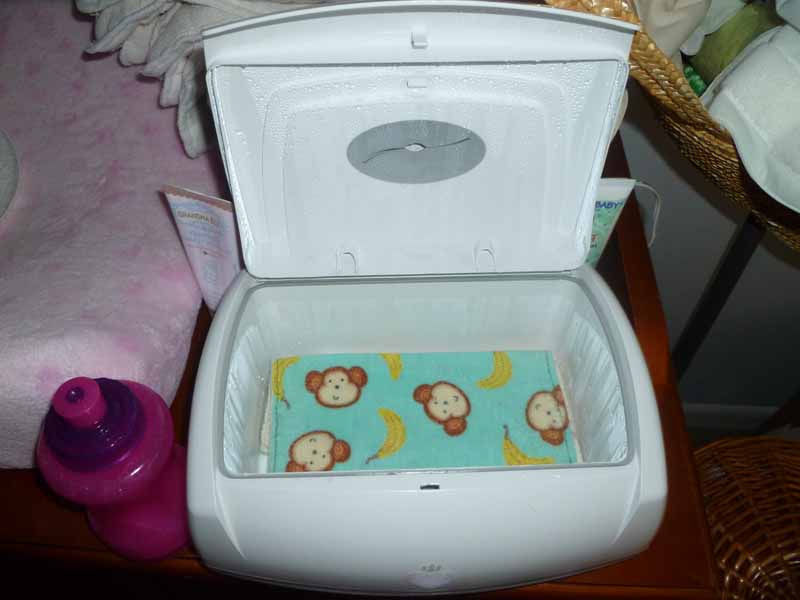 Speaking of the warmer, we went with Prince Lionheart’s Wipes Warmer 9002. It’s your basic wipes warmer that’s meant for regular wipes, but we use it for our reusables. There’s a pad in the bottom of the warmer that we wet and ring out. Then we fold the cloth wipes in half and, like making a lasagna, spray some of the solution on top. Repeat until you’re full, squeeze a little extra around the sides, close the lid and you’re good to go. You can’t pull the wipes out the top like you would a disposable, but other than that, it’s business as usual.