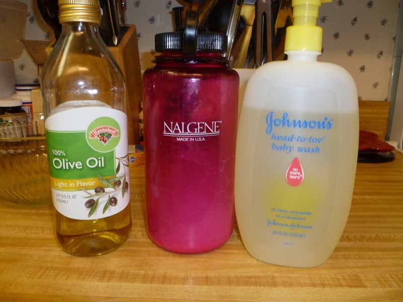 After a laundry, you can get about three days out of a fresh set of wipes as well as a bottle of solution. We fill an old Nalgene with 24 ounces of water and then three tablespoons each of olive oil and baby soap. Give that a good shake and then we transfer as much as will fit into a smaller squeeze container that we keep right next to the warmer on our changing table.