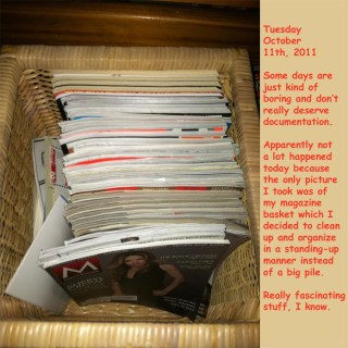 October 16, 2011June 27, 2012 TJDietsch Photo Diary: Tuesday, October 11th, 2011 Share this: Click to email a link to a friend (Opens in new window) Email Click to share on X (Opens in new window) X Click to share on Facebook (Opens in new window) Facebook Click to share on Reddit (Opens in new window) Reddit Like Loading... Related