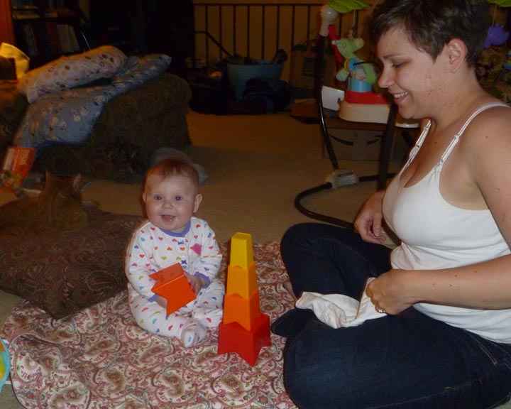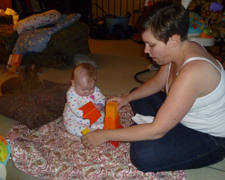 Lucy’s still too young to be able to stack or nest the blocks herself, but that doesn’t mean she’s not interested. My wife or I will stack them up in front of her and she has a tendency to grab the middle block in an attempt to pull the whole tower towards her. As you’d expect, this doesn’t work out and the blocks all fall down in front of her, but she really seems to like winding up with just the one block.