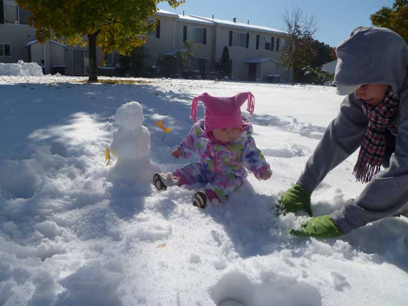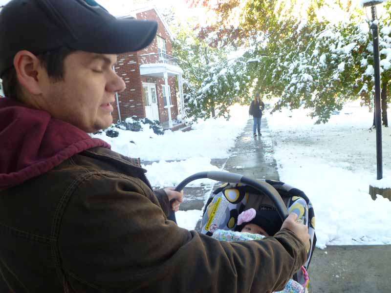 We even came up with a pretty great family costume idea for the party’s “wildly inappropriate” theme. My wife worked on the baby’s costume and we each figured out our own looks that we got ready towards the end of last week. On Friday afternoon, my parents came in, but by then we started hearing about an unexpected event for the end of October: a snow storm. I usually don’t take things like this too seriously as the meteorologists/stations around here tend to blow things way out of proportion, but considering how early in the year this one was, I had a feeling it was going to be as bad as they were saying (which was 4-6 inches during Saturday with an accumulation of 10-12 over night). There was also the threat of power outages and fallen trees because they all still had so many leaves. As the snow or ice fell, the leaves would freeze and add a ton of weight to the branches, making them crack.