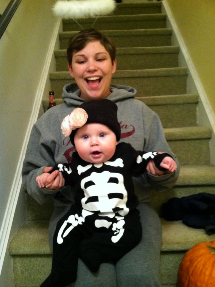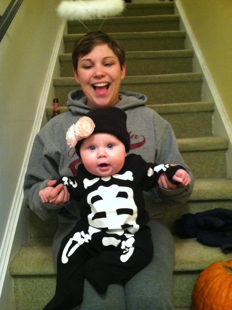 Anyway, Lucy seemed to get into the spirit. We put her in her top secret Halloween party costume and took a few pictures, but her main suit of clothes for the evening was the above glow-in-the-dark skeleton onesie that was super cute if not very glow-y. My wife sat with her on the steps as I stood at the door and passed out candy. Since we’re on the second floor, it’s actually easier to just hang out on the landing instead of running up and down, though I could probably use the exercise.