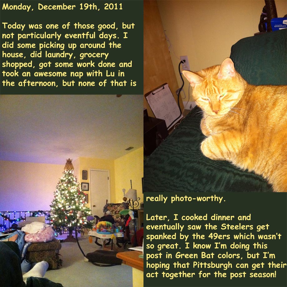 December 21, 2011June 27, 2012 TJDietsch Photo Diary: Monday, December 19th, 2011 Share this: Click to email a link to a friend (Opens in new window) Email Click to share on X (Opens in new window) X Click to share on Facebook (Opens in new window) Facebook Click to share on Reddit (Opens in new window) Reddit Like Loading... Related