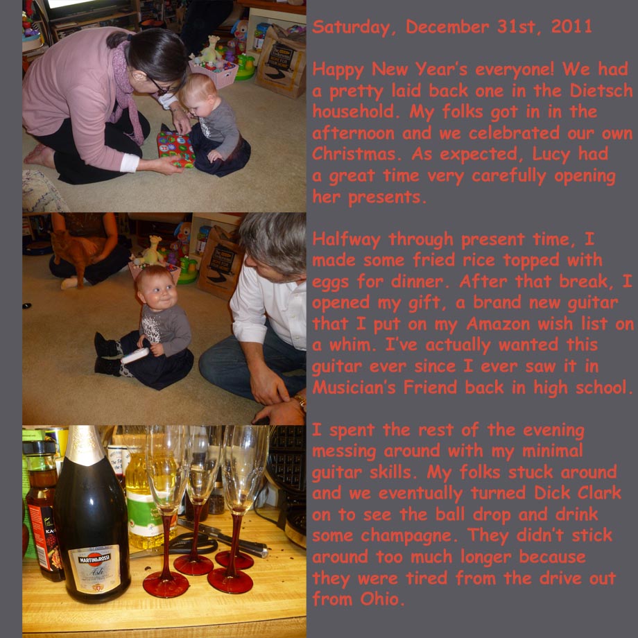 January 9, 2012June 27, 2012 TJDietsch Photo Diary: Saturday, December 31st, 2011 Share this: Click to email a link to a friend (Opens in new window) Email Click to share on X (Opens in new window) X Click to share on Facebook (Opens in new window) Facebook Click to share on Reddit (Opens in new window) Reddit Like Loading... Related