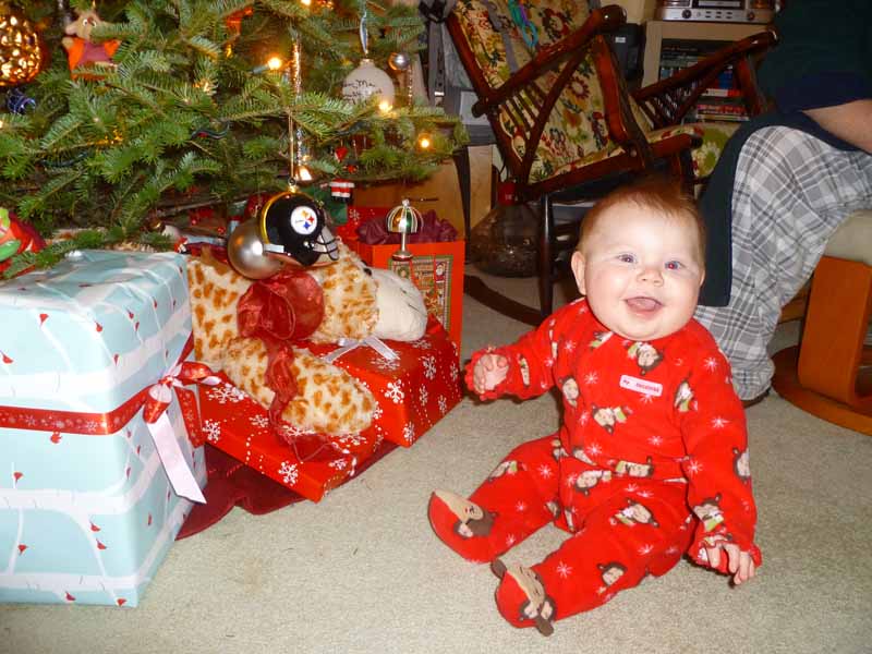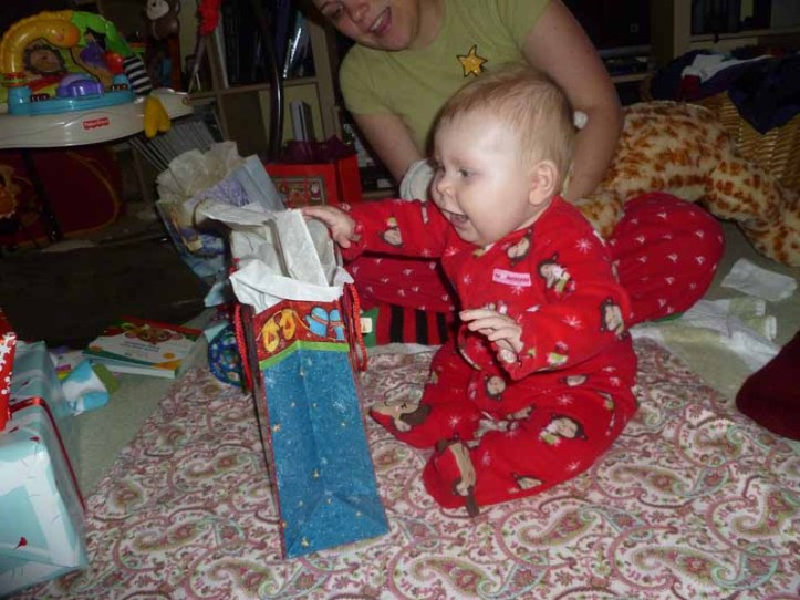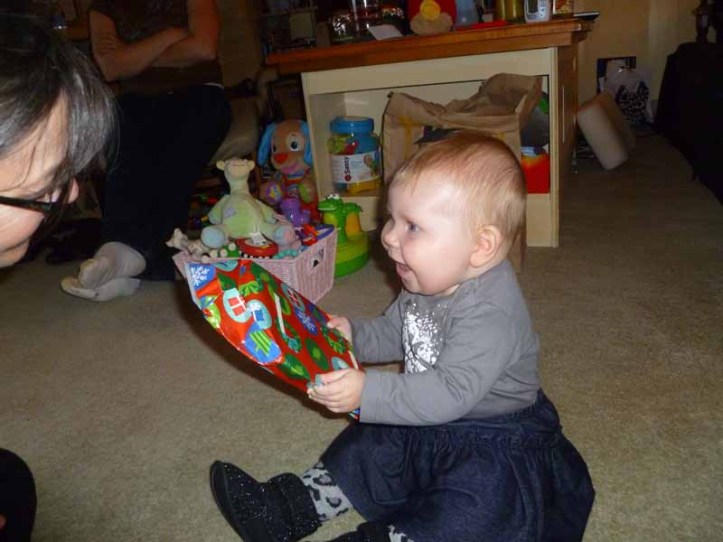 By 1PM we were on the road to Massachusetts for a party with Em’s family at her uncle, aunt and cousin’s house. It was a really nice party and fun to see everyone. Nearly everyone had met Lucy when we stayed near the ocean over the summer, but she’s changed so much that it was a good chance for them to see how she’s grown. That night we went up to Em’s parents’ house in New Hampshire and, after Lu went down for the night, we opened our presents. The next morning it was all about Lu who really started to get the hang of opening presents, though she was still very careful and delicate with the process.