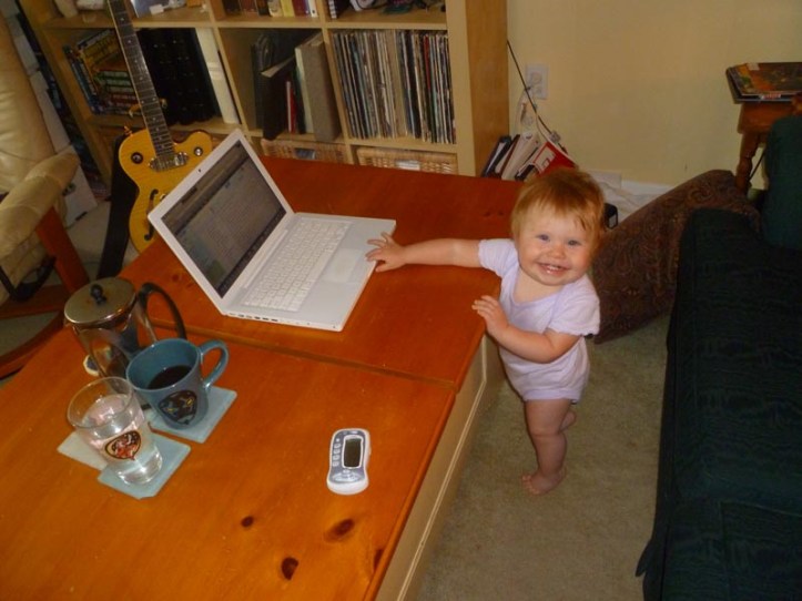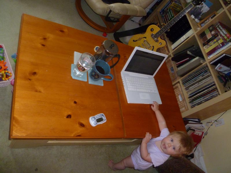 Since then, I’ve had an increasingly shrinking are I’ve dubbed the safe zone. As Lu so kindly demonstrated in the above photo, it’s basically an inch or two away from the kid’s arm span. As she’s gotten bigger the safe zone has shrunk and the danger zone only increased. The only real safe place is indicated on our table by those four coasters and the computer’s locale. I used to use a lap desk, but it’s bulk crossed over into the danger zone and gave her an easy handle to pull the computer towards her and smash the keys.