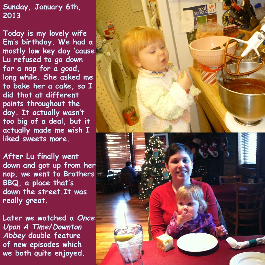 January 7, 2013 TJDietsch Photo Diary: Sunday, January 6th, 2013 – Happy Birthday Em!! Share this: Click to email a link to a friend (Opens in new window) Email Click to share on X (Opens in new window) X Click to share on Facebook (Opens in new window) Facebook Click to share on Reddit (Opens in new window) Reddit Like Loading... Related