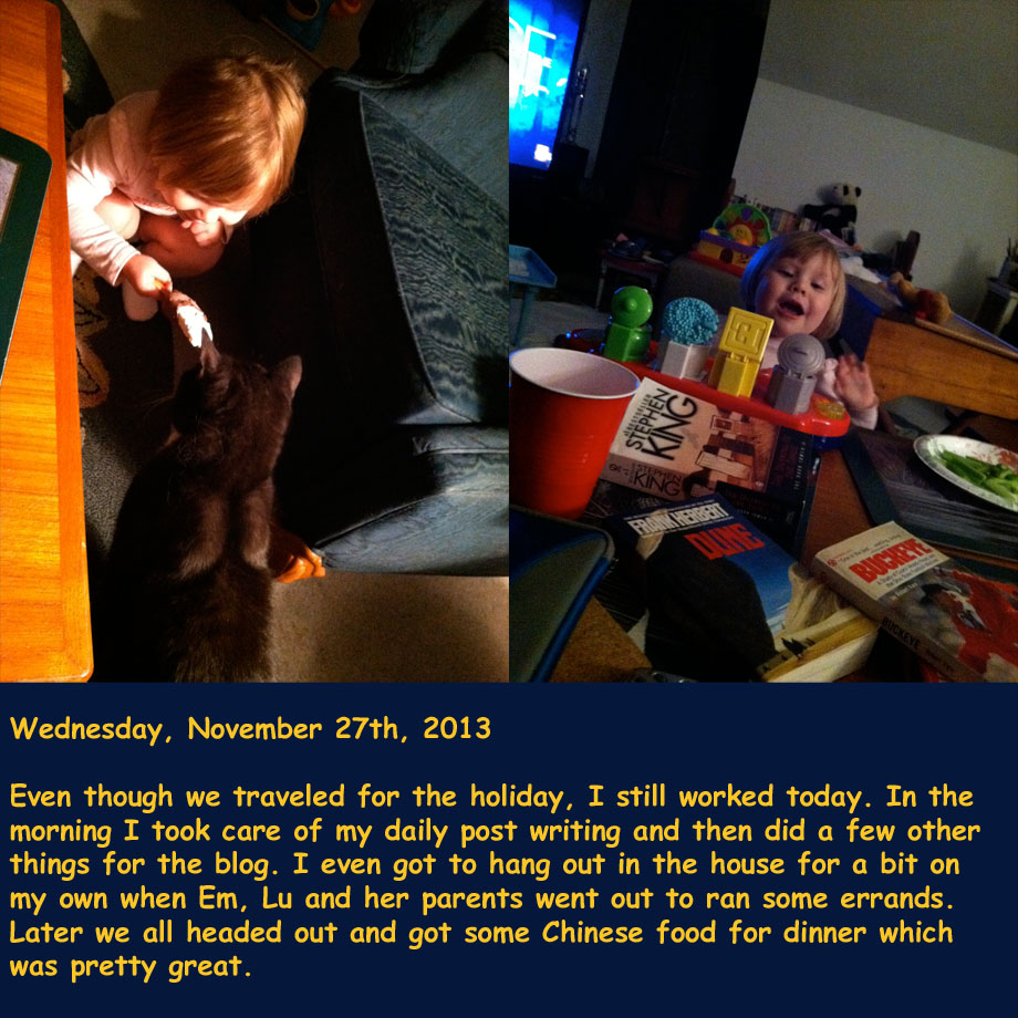 November 30, 2013 TJDietsch Photo Diary: Wednesday, November 27th, 2013 Share this: Click to email a link to a friend (Opens in new window) Email Click to share on X (Opens in new window) X Click to share on Facebook (Opens in new window) Facebook Click to share on Reddit (Opens in new window) Reddit Like Loading... Related