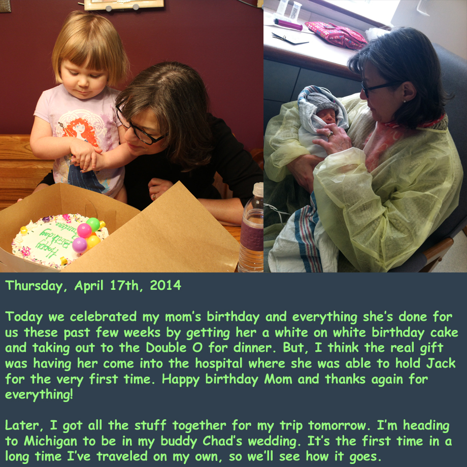 May 6, 2014 TJDietsch Photo Diary: Thursday, April 17th, 2014 – Happy Birthday Mom! Share this: Click to email a link to a friend (Opens in new window) Email Click to share on X (Opens in new window) X Click to share on Facebook (Opens in new window) Facebook Click to share on Reddit (Opens in new window) Reddit Like Loading... Related