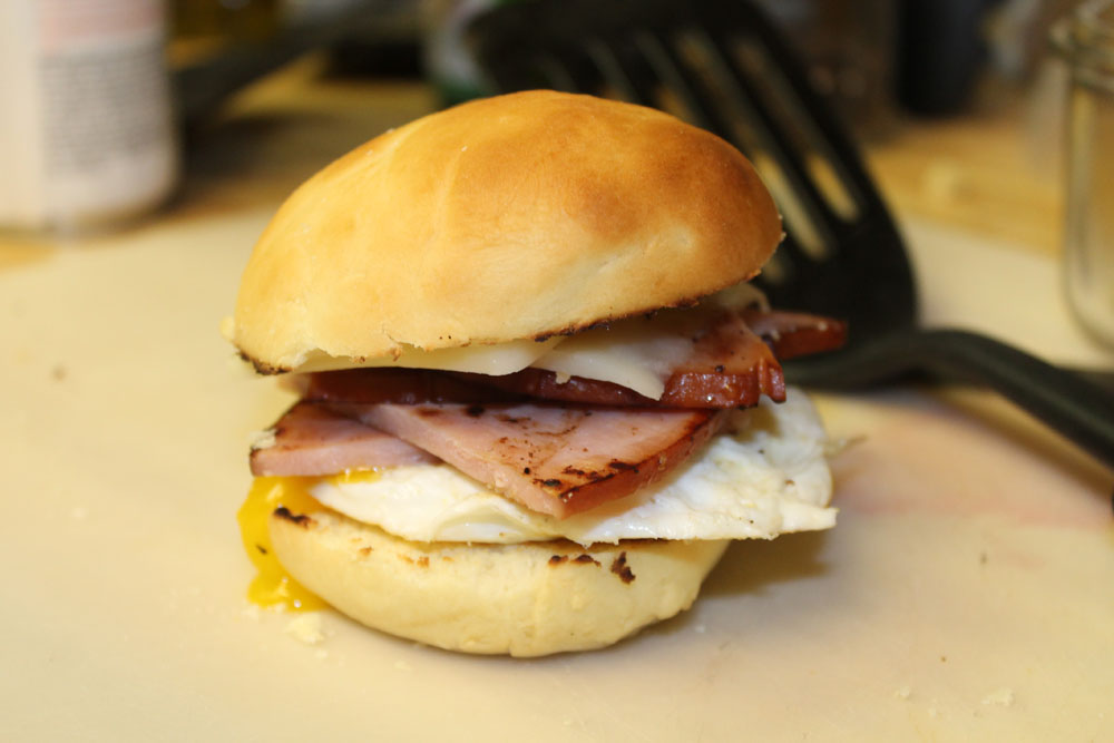 I should also note that I made these two different ways. The first time was with the mixer and the second was just by hand in a big bowl. Both worked really well. I’d probably go with the bowl just because it makes fewer dishes, really. Anyway, these buns turned out so good in both forms that I had trouble keeping everyone away from them so we could have burgers on them. They’re just so light and airy with a bit of sweetness that makes for awesome rolls or buns. In fact, as you can see in the following images, they also make great rolls for mini breakfast sandwiches if you’ve got some spare eggs, cheese and ham/bacon/sausage around! IMG_7192
