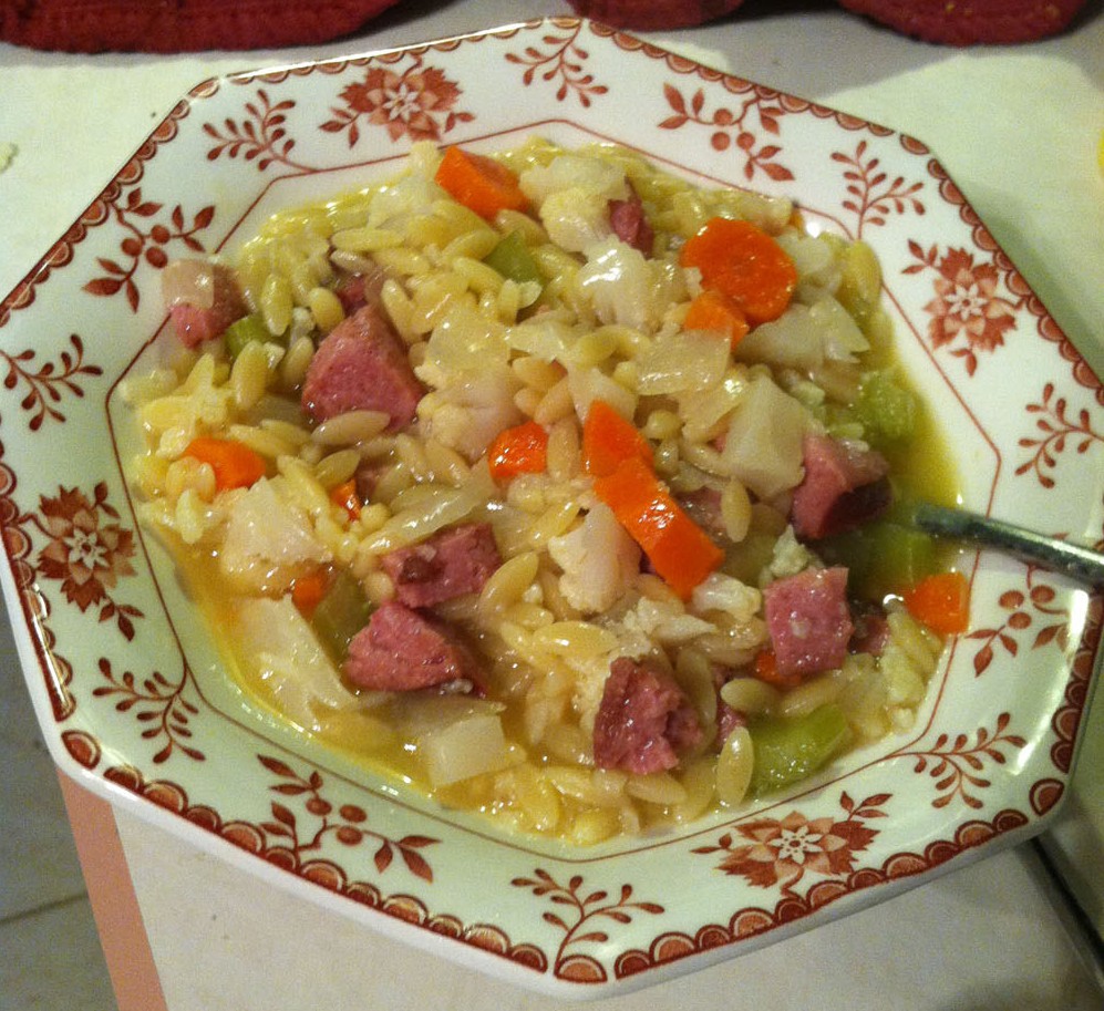 As I mentioned a few weeks back, I found myself in a dilly of a pickle one night when my slow cooker failed to cook slowly and I needed something to feed my family. I looked in my fridge, saw a packaged kielbasa sausage, some chicken stock, half of a head of cauliflower and figured I could make something work.