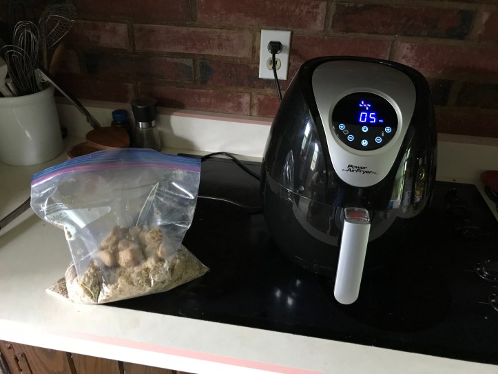 The other week I borrowed my parents’ Power Air Fryer and the first recipe I wanted to try was my world famous (if you ask my kids) Pretzel Chicken. Usually, dredge chicken chunks in eggs, cover in ground-up Utz Sourdough Specials Extra Dark Pretzels (so good, you guys) and fry in vegetable oil, but wanted to try something different. So, I used Show Me The Yummy’s Air Fryer Chicken Nugget recipe as a base and went from there. I chose this one because you soak the chicken in milk (I didn’t have buttermilk on hand and forgot about the vinegar trick) and pickle juice. I wound up doing 1/3 a cup each of milk, pickle juice and chicken stock for a little extra flavor. Then I worked in batches with the Air Fryer.