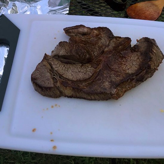 While that cooked, I got my steak ready (I think it was a sirloin, I’ve got to get back in the habit of noting these things). Again this was just a matter of doing the olive oil/salt thing and letting it come up to room temperature. By the time the beets and turnips were done — they had a great char on them that I’ve never gotten in the oven — I set them aside on a metal table, placed another cast iron skillet with olive oil in it on the fire and let it heat up. When I got it how I like it, I used my grill tongs to add the steak and let fire and metal do their beautiful thing to beef for several minutes before even looking at it. Once the first side had that nice brown hue I like, I flipped it over and waited again, trying not to mess with it too much.