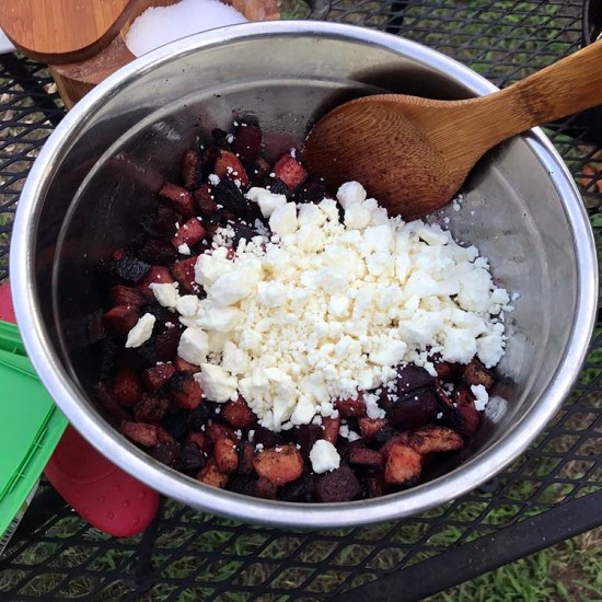 I didn’t use any recipes for this meal and just went in instinct, but did develop a plan. When I roast beets and other root vegetables in the oven, I usually dice them, dust with salt, onion powder and garlic powder and mix with olive oil before putting them in at 350 degrees for 45 minutes to an hour which gets them nice and fork-tender. That seemed like a good roadmap for the on-the-fire version so I brought my ingredients down to a table outside and got to work prepping. A little before five, I put my combination in a cast iron pan and laid that right on the fire grill which had been going for a few hours by then. It was so cool because you could hear the oil sizzling! Every 10-15 minutes I would give the veggies a stir with a wooden kitchen spoon in one hand and a silicone oven mitt gripping a silicone handle cover in the other.