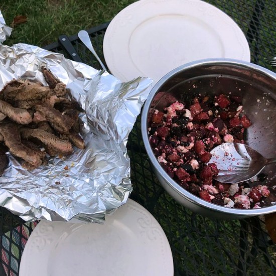 When both sides felt right, I pulled that whole pan off the grill, transferred the meat to a cutting board and tented it with tin foil. My root veggies had been sitting for a bit, so I tossed them back on the grill and heated through for just a few minutes. I then scooped the skillet’s contents into a bowl and mixed with a tablespoon or two of red wine vinegar (with the mother if you can get it) and a container of feta to give it that nice tang. With that mixing nicely as a cocktail party, I sliced the beef and dinner was served!
