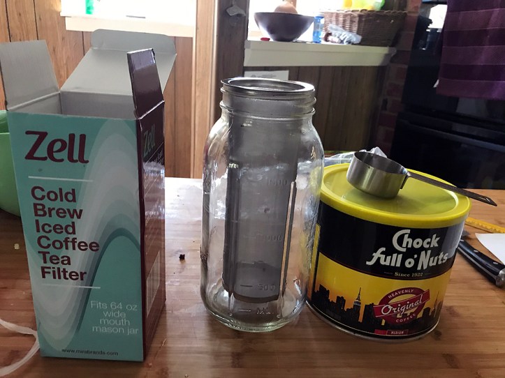 Okay, so here goes. After looking around a bit on Amazon, I came across the Zell Infuser. This is a metal mesh tube with an open top that hangs inside of a jar. You add the coffee, pour in water until its full and slap on a lid (I’m a big fan of the reusable plastic ones that come in either white or dark gray). Zell has two different options when it comes to size: 32 and 64 ounces. Even though I didn’t have a 64 ounce jar, I knew that I would want more coffee, so I bought one of those on Amazon as well (I’m not sure if it was this exact one, but here’s one for about $20) so the whole set-up cost about $32 plus your preferred coffee, mine is Chock Full O’ Nuts.