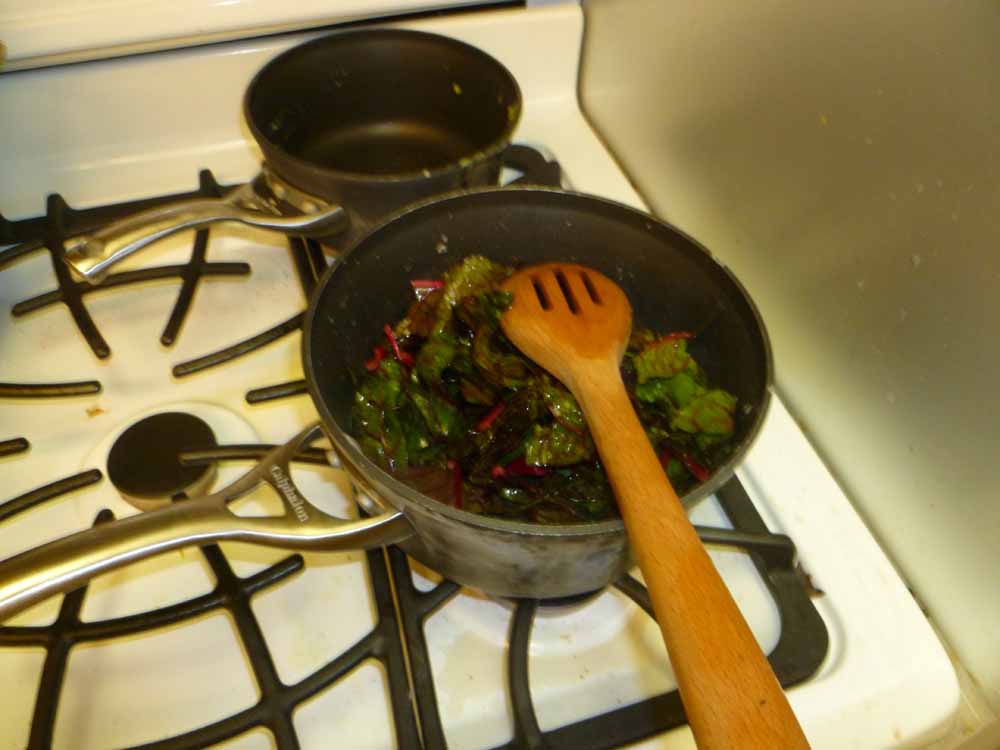 3 red swiss chard leaves added to pot
